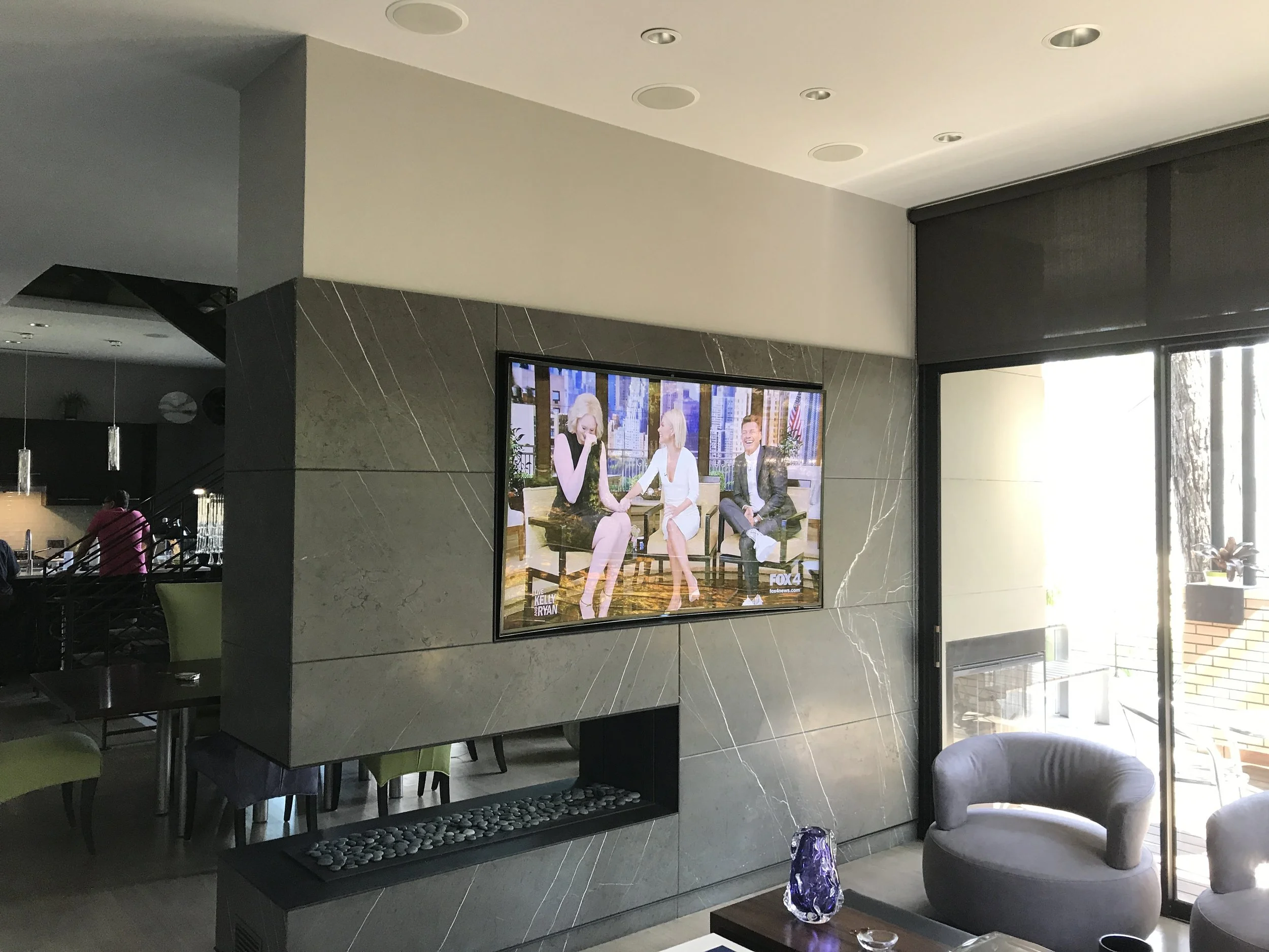 Modern hotel lobby with a wall-mounted flat-screen TV playing a talk show, a curved armchair near a large glass window, and a table with a purple vase. Other seating and a person in pink are visible in the background.